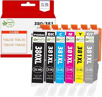 【korin本舗】BCI-380XL BCI-381XL 互換インクカートリッジ キャノン(Canon)用 プリンター インク BCI-380 BCI-381 380 381 6色セット(BCI-380PGBK BCI-381BK BCI-381C BCI-381M BCI-381Y BCI-381GY) 合計6本 増量 残量表示 TS8130 TS8230 TS8330 TS8430 | PCBASE