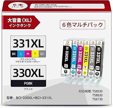 【対応機種】キャノン(Canon) PIXUS TS8530 TS8630 TS8730 プリンター ★ご注意:ご注文する前に、対応機種をお確かめください。「パッケージ内容」:BCI-331XLシアン (C) 1本/マゼンタ (M) 1本/イエロー (Y) 1本/グレー(GY) 1本/ブラック (BK) 1本/BCI-330XLブラック (PGBK) 1本 総計6本 説明書1枚