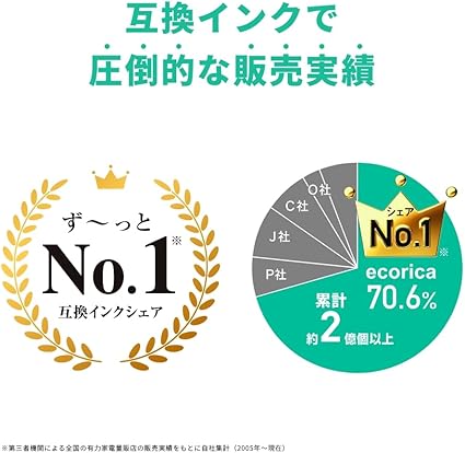 エコリカはエコマーク認定商品。第三者評価により純正品と同等の印刷枚数を保証されております。品質・安全性・環境面の厳しい基準をクリアした製品です。