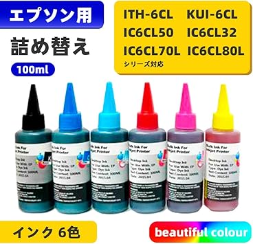 純正型番:エプソン 100ml エプソン KUI / ITH /SAT/ IC80 / IC70 / IC50 シリーズ対応の染料系補充用インク6色セットです。