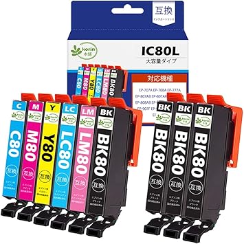 【korin本舗】IC6CL80L エプソン用 インクカートリッジ IC6CL80 IC80 80L とうもろこし 6色セット(ICBK80 ICC80 ICM80 ICY80 ICLC80 ICLM80)+黒3本(合計9本) 増量 説明書付 残量表示 個包装 EP-707A EP-708A EP-808AB EP-808AR EP-808AW など | PCBASE