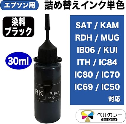【商品内容】エプソン SAT / KAM / RDH / MUG / IB06 / KUI / ITH / IC84 / IC80 / IC70 / IC50 対応 染料系 詰め替えインク(ブラック)。インク容量純正の約2.5倍(KUIの場合)【セット内容】インクボトル ( 染料ブラック )30ml×1本・手袋・取扱説明書