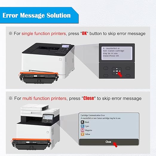 1.注意: プリンターに「Canon 純正モード」がある場合は、このモードを閉じる必要があります。次手順に従て、Canon 純正モードを閉じてください: [管理設定] > [デバイス管理] > [Canon 純正モード] > [オフ]。Canon 純正モードを閉じた後、 互換性のあるトナーをインストールすると、プリンターに「Canon 以外のカートリッジが挿入されている可能性があります」というメッセージが表示されます。単機能プリンターの場合は「OK」キーを押す、多機能プリンターの場合は画面で「閉