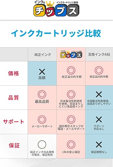 [クオリティ] 最新ICチップ搭載でインク残量検知対応。日本製添加剤を使用した発色が良く目詰まりしにくい「HDカラー」を採用。(純正インクとの併用も動作確認済みです。)