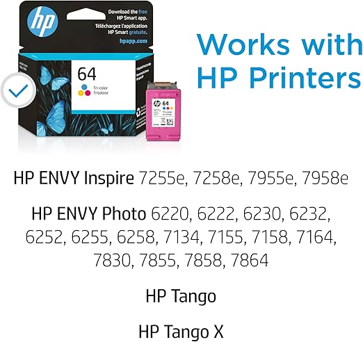 HP 64インクカートリッジは、HP ENVY Photo 6252、6255、6258、7155、7158、7164、7855、7858、7864に対応しています。 HP ENVY 5542。